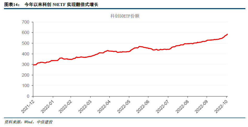 除了机构因为看好科创板当前的性价比和后续强劲的业绩增长而加大对科创板的配置比例之外,投资科创板的各种工具也不断的丰富之中。今年以来科创50各个ETF的份额基本实现了翻倍式增长,从年初的295亿份增长到11月初的586亿份。今年9月,2只科创板新材料ETF,2只科创板芯片ETF迅速获批上市。11月4日,上证科创板成长指数将正式发布,该指数从科创板上市公司中选取营业收入与净利润等业绩指标增长率较高的50只上市公司证券作为指数样本,反映科创板具有高成长特征的上市公司证券的整体表现。有望更加及时的反映科创板上市证券的表现,为市场提供多维度投资标的和业绩基准。