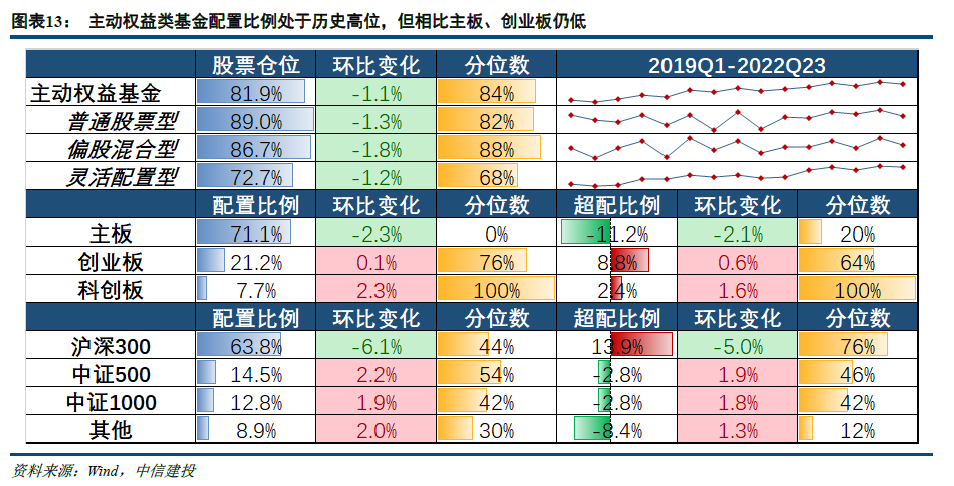 此外,机构科创板配置比例整体呈现出持续上升的大趋势。主动权益类基金对科创板的配置比例处于历史最高水平,Q3环比上升2.3%,超配比例环比上升1.6%。相比创业板,科创板目前配置比例和超配比例仍然偏低,有进一步增配空间。
