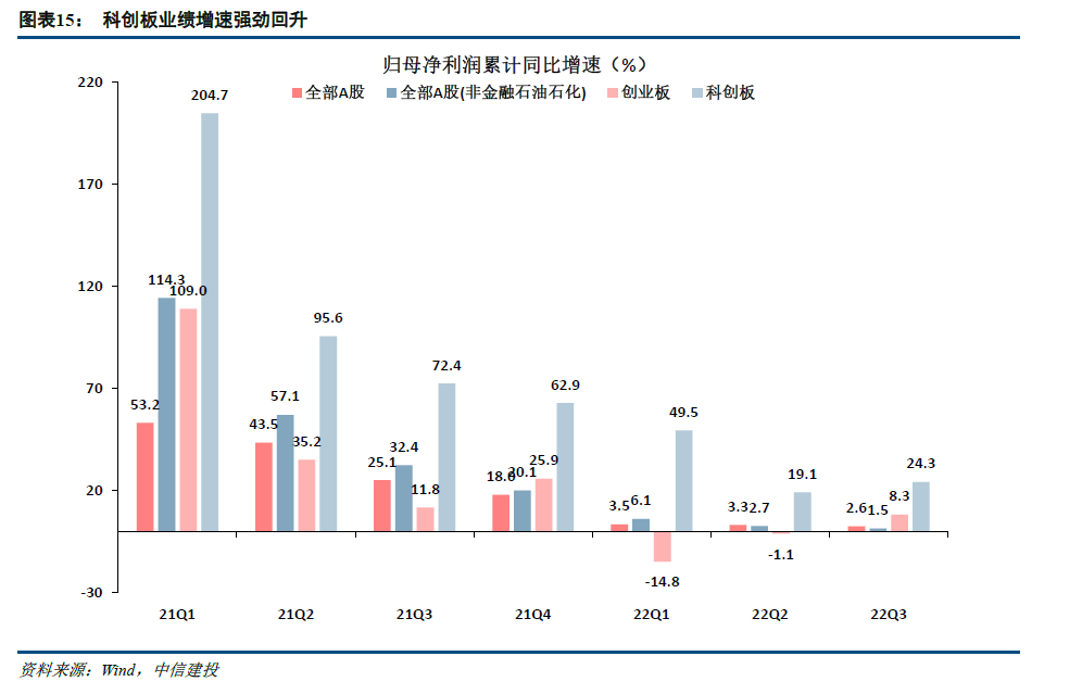 与2013年Q1创业板类似,当前科创板盈利增速领跑全A,受益于新经济方向独立景气趋势,预计科创板后续盈利韧性将保持强势。2022年Q3科创板盈利继续领跑市场,归母净利润累计同比较2022H1升5.2pct至24.3%。主要受电池、光伏等新能源方向业绩同比大幅高增拉动。从ROE(TTM)来看,科创板Q3相比2022H1上行1.6pct到10%,明显超出市场平均水平,韧性彰显。后续来看,目前科创板整体业绩受到半导体相关板块的下行周期拖累,从历史角度看半导体每一轮下行周期在15-22个月左右,目前已经过半,因此明年来看半导体目前的拖累将会逐步转化为支撑。