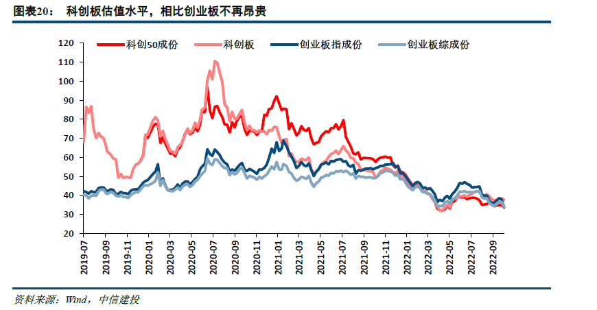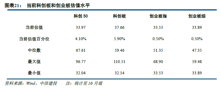 估值方面,目前科创板与2012年的创业板类似,均位于历史底部。从去年以来,科创板在经历长期以来的持续调整之后,目前处于一个配置性价比较高的位置。在PE估值方面,科创50目前估值仅为34倍,与创业板估值基本相当(注:统计口径为市盈率(TTM,整体法,剔除负值))。科创板则以约38倍的整体估值水平同样处于历史低位,考虑到明年相比于创业板更高的业绩增速,科创板目前较好的性价比将有利于吸引资金持续流入科创板。
