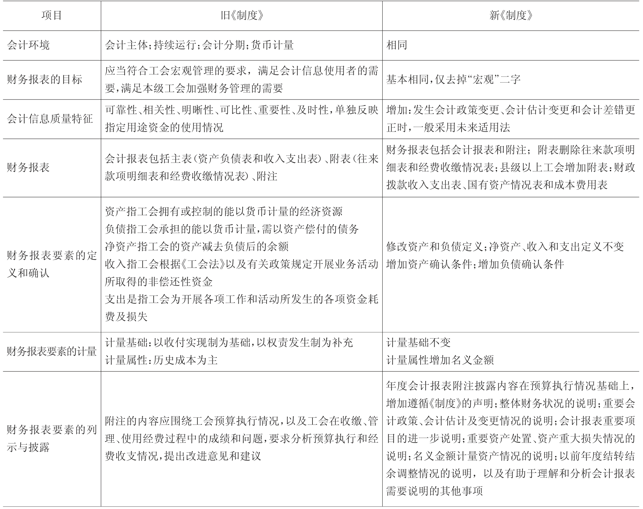 工会财务报表概念框架的主要内容散见于《制度》中。本部分通过将新旧制度下概念框架的相关内容进行比较,主要涉及会计环境、财务报表的目标、会计信息质量特征、财务报表、财务报表要素的定义和确认、财务报表要素的计量、报表列示与披露七个方面。具体比较见表1。