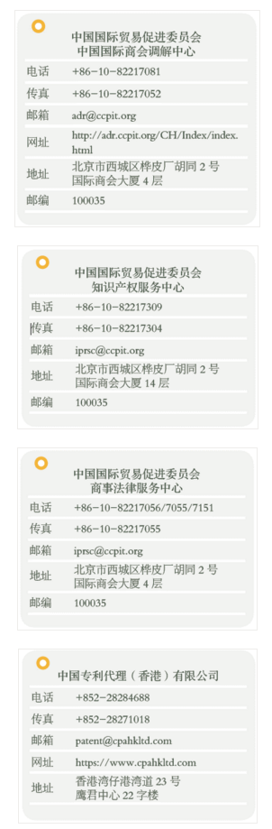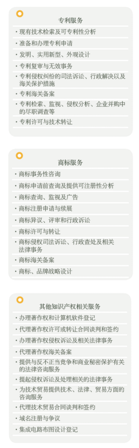 中国贸促会自1957 年起开展知识产权服务,是中国最早开展涉外知识产权服务的机构,为中外企业在专利、商标、著作权域名、商业秘密、商业外观、不正当竞争等知识产权相关领域提供咨询、申请、调解、行政保护和诉讼服务。中国贸促会下设中国贸促会专利商标事务所、中国专利代理(香港)有限公司、中国贸促会知识产权服务中心等三家知识产权代理和维权机构,在北京、纽约、东京、慕尼黑、日内瓦、马德里、中国香港、上海、广州、深圳设有分支机构。
