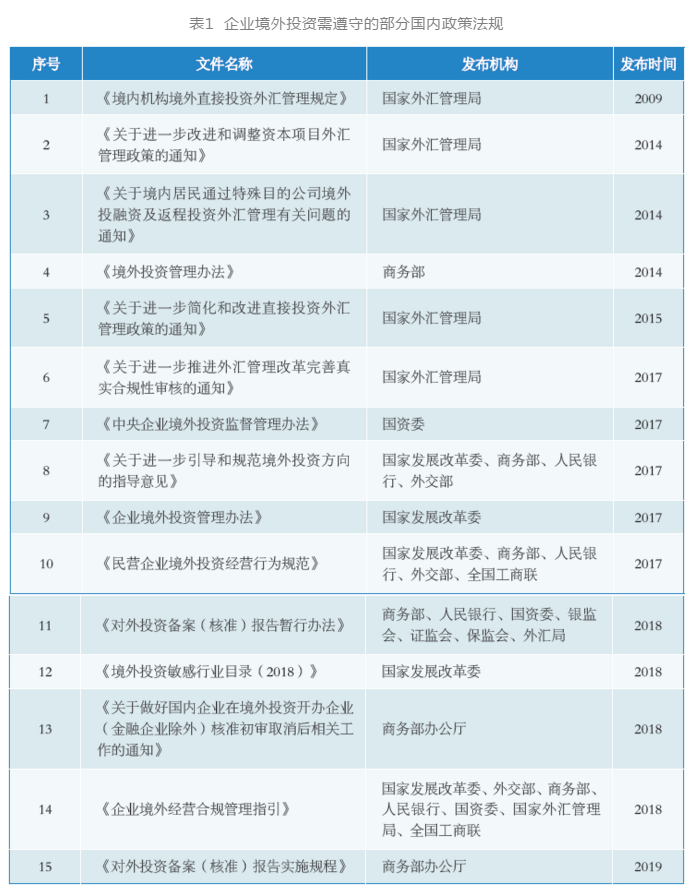 企业境外投资需要遵守的国内相关政策法规主要包括国家发展改革委、商务部、国资委、国家外汇管理局等部门制定的相关政策法规等。详见表1。