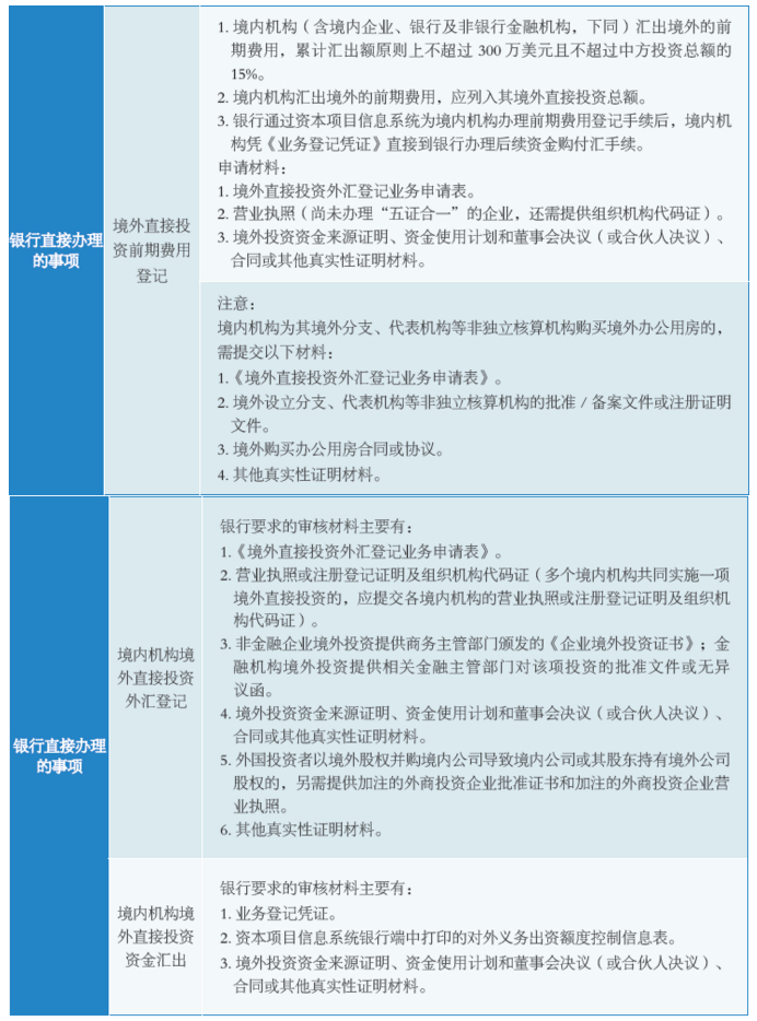 根据国家外汇管理局相关规定,企业境外直接投资获得境外投资主管部门核准或备案后,由银行按照《直接投资外汇业务操作指引》直接审核办理外汇登记,国家外汇管理局及其分支机构通过银行对外汇登记实施间接监管。2017 年1 月,国家外汇管理局发布《关于进一步推进外汇管理改革完善真实合规性审核的通知》(汇发〔2017〕3 号),要求境内机构在办理境外直接投资登记和资金汇出手续时,除按规定向银行提交相关审核材料外,还应说明投资资金来源与资金用途(使用计划)情况,提供董事会决议(或合伙人决议)、合同或其他真实性证明材料,从而进一步加强对境外直接投资真实性、合规性的审核,详见表3。