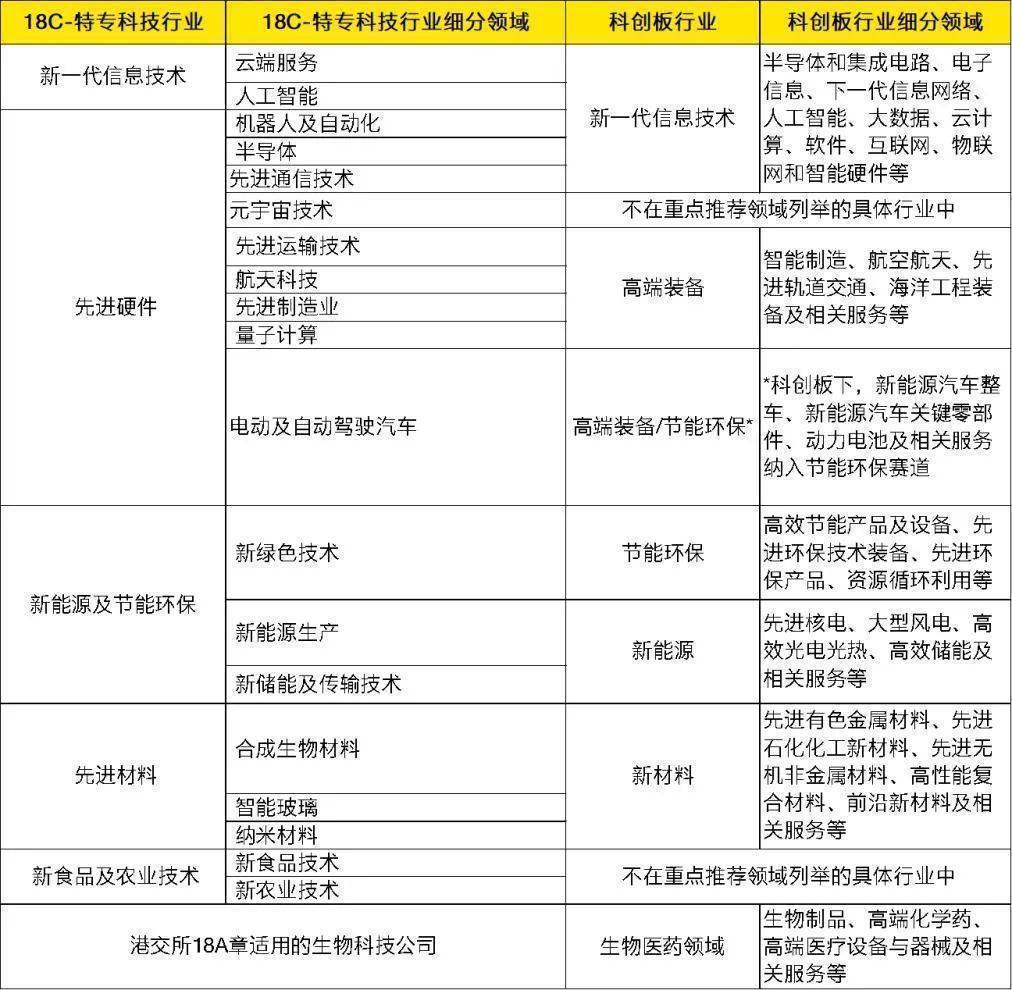 港交所18C章涉及的五大特专科技行业为新一代信息技术、先进硬件、先进材料、新能源及节能环保、新食品及农业技术。科创板硬科技赛道主要包括新一代信息技术、高端装备、新材料、新能源、节能环保、生物医药及其他符合科创板定位的领域。港交所18C章与科创板在新一代信息技术、先进硬件、先进材料、新能源及节能环保行业领域均存在一定的交叉重合,18C章中的新食品及农业技术不在科创板重点推荐领域列举的具体行业中,科创板的生物医药领域对应港交所18A章标准。