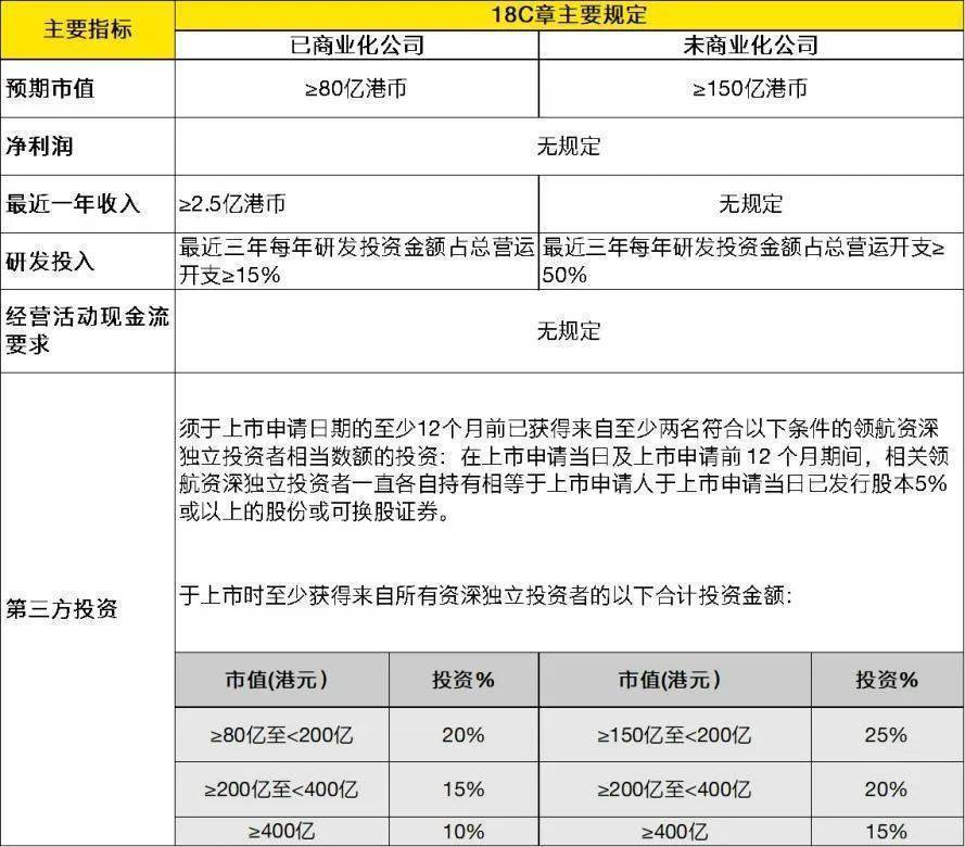 港交所18C章主要关注预期市值且要求更高,达80亿或150亿港币,注重上市发行人历史融资情况。科创板则整体考虑企业市值、收入、利润、现金流等综合财务表现。
