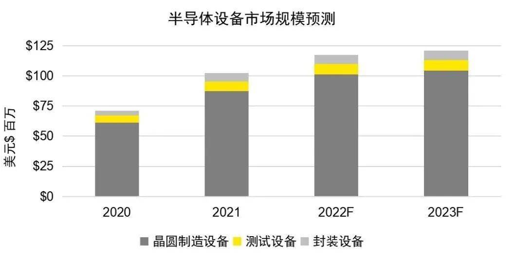 半导体设备方面,根据国际半导体设备与材料协会 (SEMI) 的数据,2022年晶圆制造设备销售额预计突破1000亿美元,其中光刻机、干法刻蚀设备和CVD市场规模分别占晶圆制造设备市场19%、20%和11%;封装设备销售额预计77.6亿美元,其中键合机、切割机、焊线机三类设备价值量分别占封装设备市场14%、13%和11%;测试设备销售额预计87.7亿美元,测试机、分选机、探针台市场规模占测试设备市场比例分别为33%、9%、8%。2023年预计晶圆制造设备和封装测试设备的销售额将保持在2022年的高位水平。