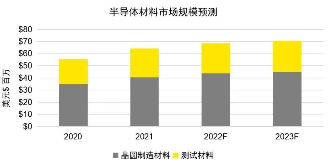 半导体材料方面,根据SEMI数据,2022年晶圆制造材料市场规模预计约438亿美元,其中硅片、特种气体和光掩膜板三类材料价值金额分别占晶圆制造材料市场的35%、13%和12%;封测材料市场规模预计248亿美元,其中封装基板、引线框架和键合金属丝市场规模分别占封装材料市场的39%、16%和15%。
