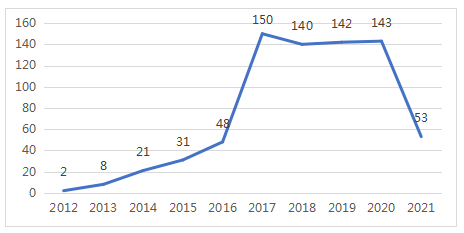 在中国裁判文书网以“骗取出口退税罪”为案由进行检索,结果显示,在2012年-2017年期间,外贸行业骗取出口退税刑事案件的相关判决、裁定文书数量呈逐年递增趋势;2017年-2020年,文书数量达到高位,保持在每年140份以上。判决、裁定文书的数量能够直接反映案件的数量,中国裁判文书网近十年骗取出口退税罪相关文书数量情况反映出,骗取出口退税犯罪呈高发态势。