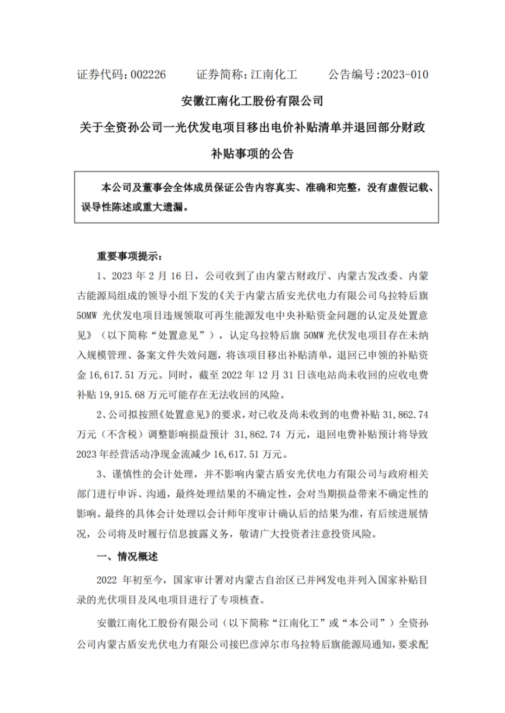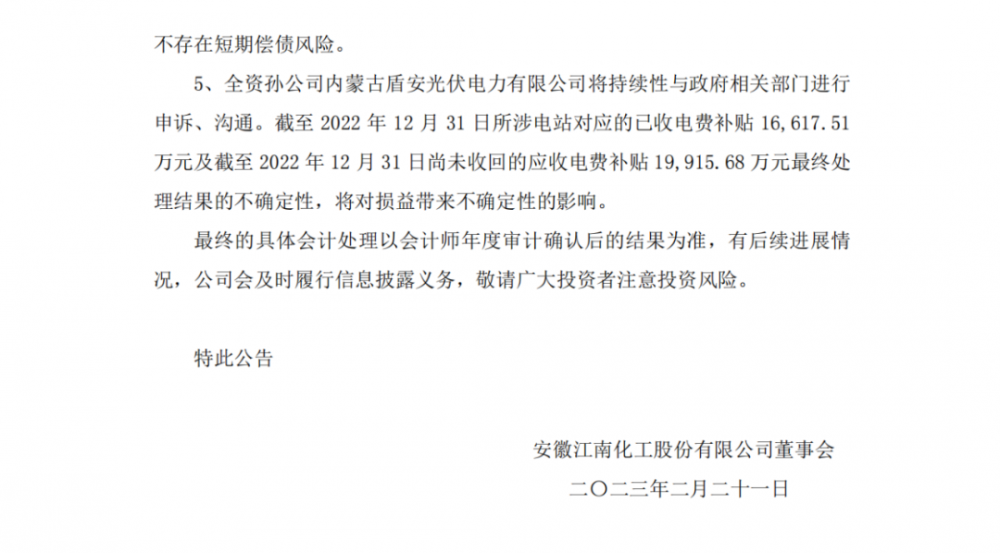 2023年10月28日,江南化工发布公告:公司投资的1个项目在名单中,需要退回已发放的1.661751亿元,剩余的近2亿元补贴,将无法收回。具体如下表所示。(详见附件)