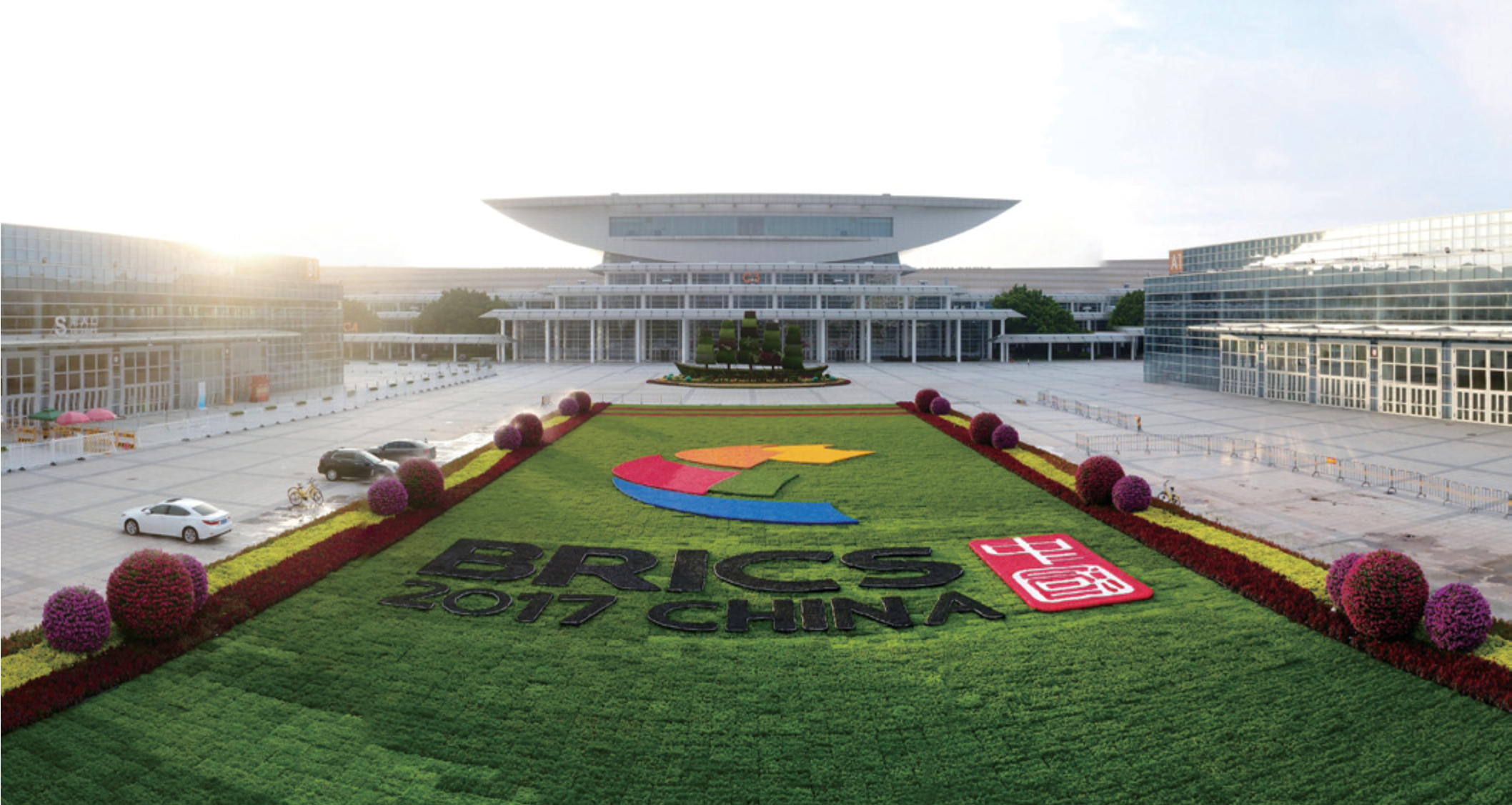 2017年金砖国家领导人厦门会晤所在地——厦门国际会展中心主题花坛(新华社图片)