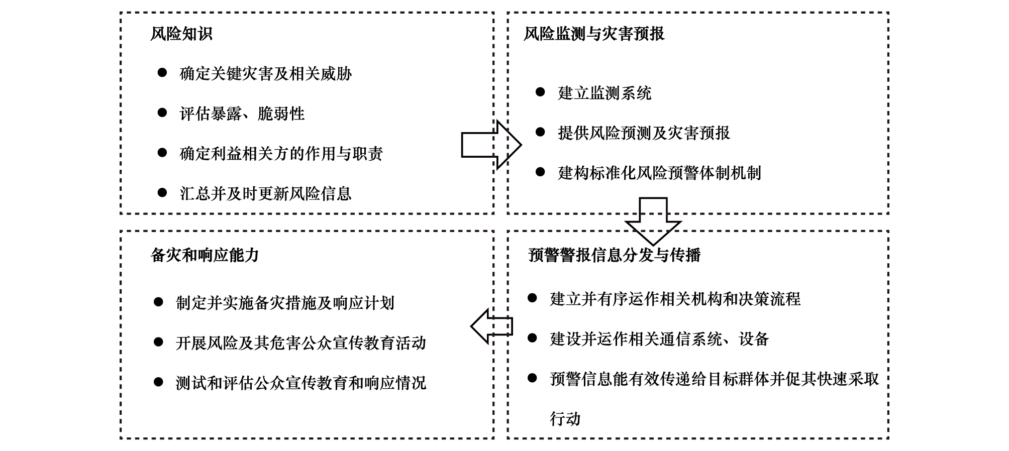ISDR促进预警平台、联合国发展计划署及世界气象组织共同指出:预警系统应综合风险知识、风险监测、风险警报和风险响应4个基本且互补的要素(图1),即事先了解面临的风险、针对风险实施监测并预报警情、向受风险的人传播警报信息,并切实增强应对风险的能力