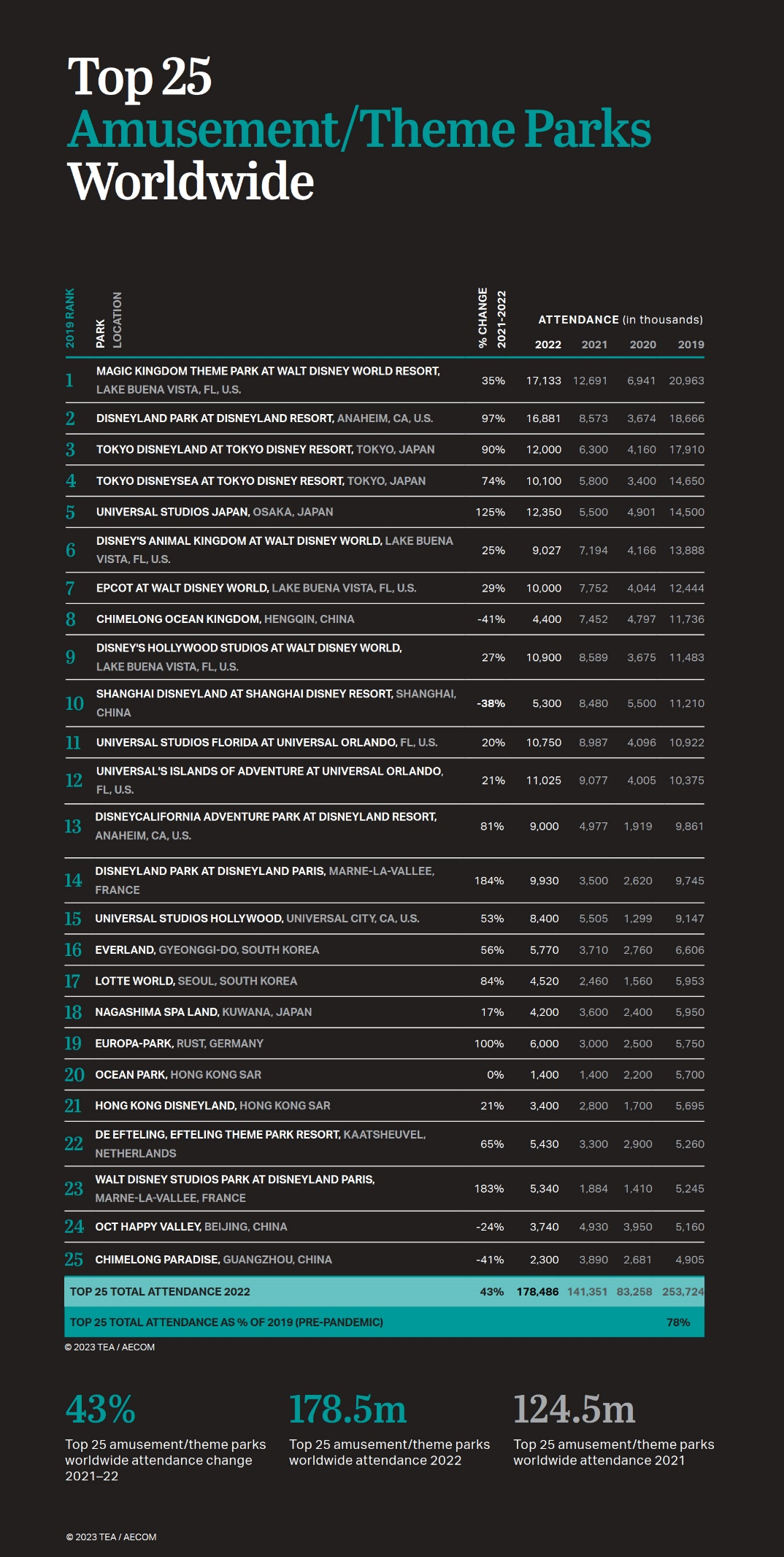 近日,AECOM联合主题娱乐协会TEA(Themed Entertainment Association)共同发布了《2022全球主题公园和博物馆报告》。报告显示,2022年是标志着市场逐渐回归常态、接近完全复苏的一年。全球范围内,许多景点的年游客量或年收入恢复至或甚至高于疫情前水平。在仍受到疫情不确定性的影响下,行业重新审视客户体验需求,结合新趋势,运用新技术,为游客提供创新产品和服务,显示出强大的韧性。
