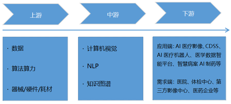 从AI医疗产业链来看,产业链上游为基础层,中游为技术层,下游为应用层,服务终端为患者。上游主要是为行业提供基础技术支持的行业,如医疗数据挖掘、算法等。中游技术层中,基于深度学习的计算机视觉发展快,参与者技术相对成熟;下游主要为医疗人工智能技术的应用层。