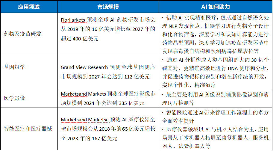 药物及疫苗研发、基因组学、医学影像、智能医院和医疗仪器四个领域将成为AI医疗发展的四个主要方向,未来AI医疗应用市场前景广阔。