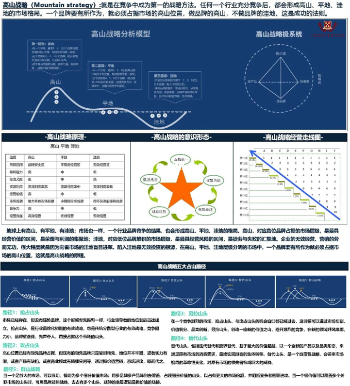 高山战略(Mountain strategy):就是在竞争中成为第一的战略方法。任何一个行业充分竞争后,都会形成高山、平地、洼地的市场格局。一个品牌要有所作为,就必须占据市场的高山位置,做品牌的高山,不做品牌的洼地,这是成功的法则。