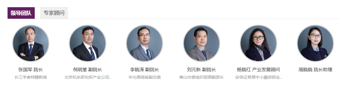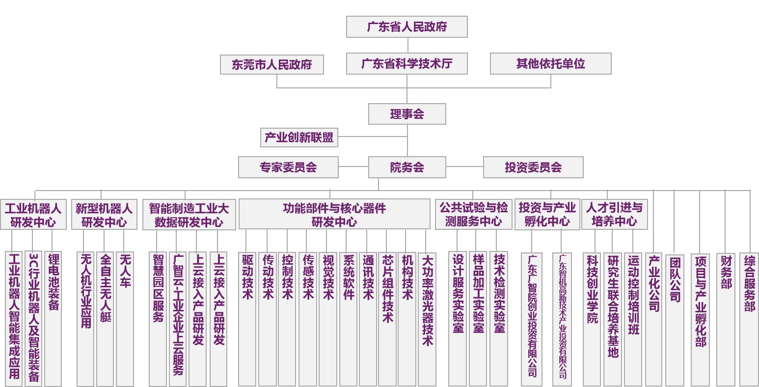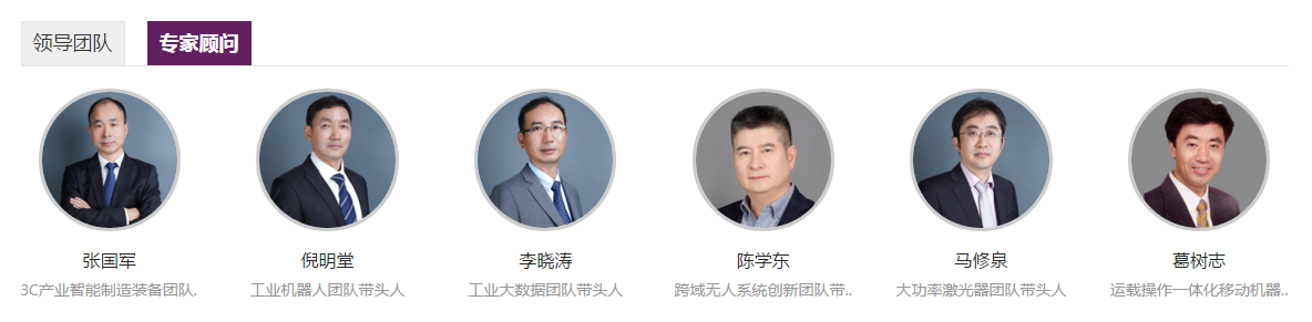 在团队建设方面,建设了一支由国家级人才牵头、专职队伍为主、海外团队充实的高层次人才队伍。管理及技术团队主要包括:由国家重点领域创新团队带头人、长江学者张国军教授担任院长,由华为前高级副总裁李晓涛(工业大数据创新团队带头人,国家科技进步一等奖获得者,排1)担任副院长,原北京机床所产业公司总经理倪明堂(工业机器人团队带头人)担任副院长,原佛山市委组织部副部长刘元新担任副院长,原安信证券公司投资总监杨晓红担任投资顾问,国家百千万人才、长江学者陈学东教授(获三个国家奖,均排1)担任跨域无人系统事业部总监,国家CAD支撑软件工程技术研究中心副主任王书亭教授担任移动机器人事业部总监。海外团队包括:新加坡工程院院士葛树志教授牵头的运载操作一体化机器人团队,香港城市大学王钧教授(IEEE计算智能大会总主席)牵头的无人艇团队,全球知名激光公司美国JDSU前高级主任工程师马修泉教授牵头的大功率激光器创新科研团队,美国密西根大学教授(美国总统奖获得者)担任首席科学家的工业大数据团队。共获批1支国家重点领域创新团队,2支广东省创新团队,1支东莞市创新团队。