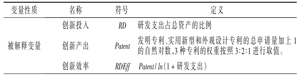 企业创新:本文从创新投入、产出和效率3 个方面构建企业创新研究框架。创新投入用年度研发投入占总资产的比例来衡量;创新产出借鉴权小锋等[28]将企业每年3 种类型专利按照3 ∶2 ∶1 的权重取值得到总申请量,然后总申请量加1 取自然对数得到创新产出成果;创新效率参考孔东民等[29]使用创新成果与创新投入的比值作为衡量方法,此比值的分子为前文的创新产出成果,分母为研发支出加1的自然对数。具体计算公式(1)如下: