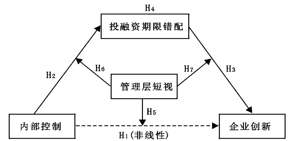 创新活动仅依靠企业自有资金是无法长期支撑的,所以企业需要从外部进行融资以保证创新活动的持续性。由于中国金融市场发展不成熟,银行仍处于金融市场主导地位,因此银行贷款是企业创新活动主要资金来源[13]。根据投融资期限匹配原则,资金的使用周期应该与项目的预计完成期限相同,具有长周期特点的创新活动需要长期信贷满足资金的持续供给,但由于银行审批严、长期信贷利息高以及使用不便利等原因,企业更倾向使用短期贷款匹配创新活动,投融资期限错配现象严重[14]。如果企业没有足够资金偿还债务,且银行不予续借,则会面临财务危机,影响创新的可持续性[15]。关于投融资期限错配,缓解机制的研究主要集中在货币政策、资本市场和银行竞争等外部视角,而对于内部治理机制的研究较少,内部控制作为重要的内部治理机制,是否能有效缓解投融资期限错配进而提升创新有待验证。除上述原因外,企业投融资期限错配还可能受管理层短视主义影响,在“理性人”假设下,管理层会考虑期限错配潜在的风险,而行为经济学认为主体决策会更倾向于个人利益,所以期限错配所带来的短期效益是引起管理层短视主义的动机。因此,在不同管理层短视主义程度下,投融资期限错配的中介效应可能存在差异。