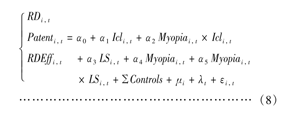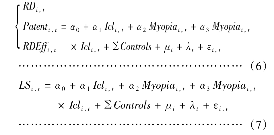 管理层短视主义调节作用检验结果如表7 所示。表7 中回归(1)—(3)Icl × Myopia 系数显著为负,且与Icl 系数符号相反,表明内部控制与企业创新的正向关系随短视主义的增加而显著降低,说明管理层存在短视主义会忽视内部控制体系,更多关注企业的短期效益,减少创新投资,假设H5 成立。由回归(4)可知,Icl × Capex 系数在10%水平显著为正,与Icl 系数符号相反,证明内部控制与投融资期限错配的负向关系随着管理层短视主义的增加而显著减弱,短视主义会增加企业监督负担,造成原有监督体系的失效,产生信息不对称问题,验证假设H6。回归(5)—(7)的LS × Capex 系数与LS 系数均显著,且符号方向一致,说明管理层短视主义越高,越会强化投融资期限错配对企业创新的抑制作用,符合短视主义的特征,管理层更倾向于短期效益大的投资项目,而放弃具有长周期效益的创新投资活动,假设H7 成立。