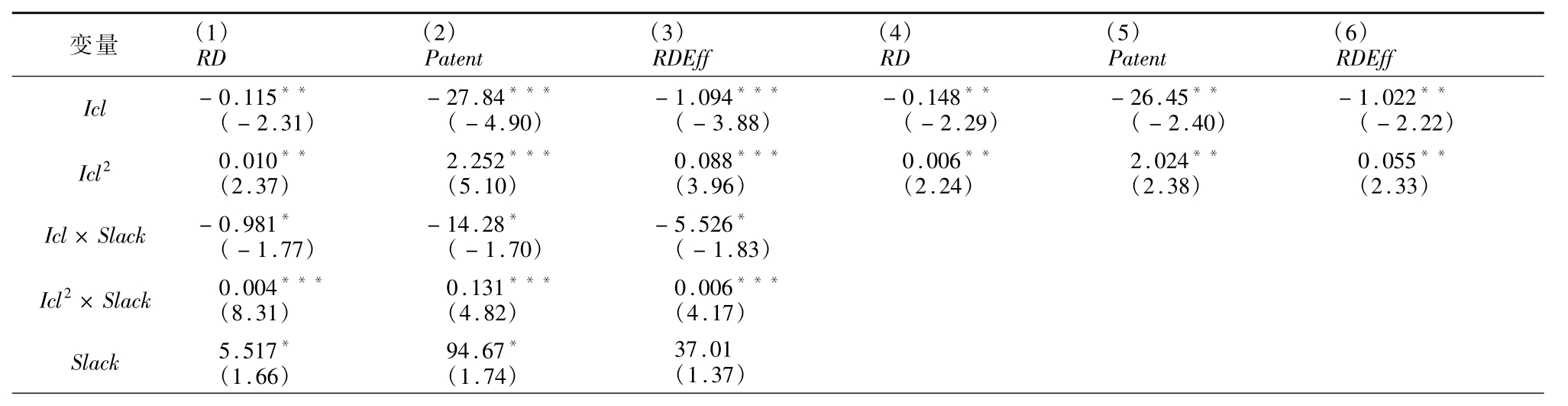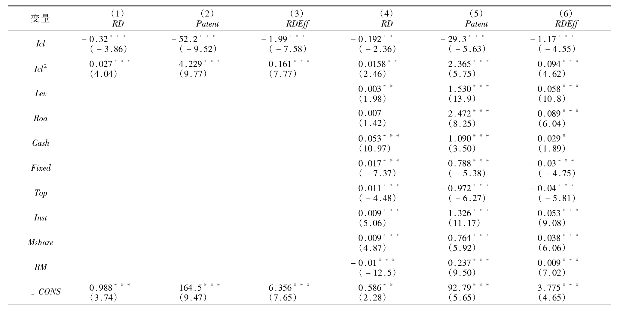 基于创新不同阶段,验证内部控制对企业创新的影响,并控制时间效应和行业效应,结果如表3 所示。回归(1)—(3)Icl 系数均在1%的水平显著负相关,Icl2 系数均在1%的水平显著正相关,一次项与二次项系数相反,加入控制变量后回归(4)—(6)系数符号和显著性没有改变,说明内部控制与企业创新存在正U 型关系,假设H1c成立。比较不同被解释变量模型,控制变量的系数方向和显著性基本相同,均符合管理学判断。股权越集中、固定资产比例越高的企业越倾向发展现有业务,阻碍企业进行创新活动,而管理层持股比例越高或机构投资者持股越多越倾向企业通过创新获得长期核心竞争力。提高企业的绩效和经营性现金流同样可以促进创新。U型曲线的拐点和左右系数符合正U 型关系假设。内部控制低于拐点时,内部控制会抑制创新投入、产出和效率,超过拐点后抑制作用转为促进作用。