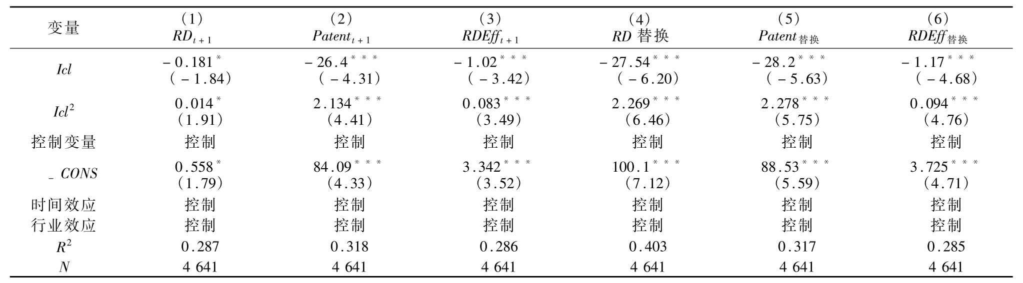 为验证结论的稳健性,本文借鉴Haans 等的方法[33],将内部控制三次项(Icl3)放入回归模型后,Icl3 并不显著,一次项和二次项的系数方向并未改变,说明没有更复杂的非线性关系。由于内部控制的影响可能存在滞后性,即内部控制产生的影响会在下一年体现出来,所以将被解释变量滞后一期,判断结论是否发生改变。表5 中回归(1)—(3)为被解释变量滞后一期的结果,结果表明Icl 和Icl2 系数方向未改变,且系数显著,结论支持正U 型非线性关系。本文还通过替换被解释变量测度方法进一步检验核心变量关系,用研发投入的自然对数作为RD指标;用专利总申请量加1 的自然对数作为Patent指标;创新效率指标用前两者比值替代。由表5 回归(4)—(6)检验结果可知,一次项与二次项系数相反且均在1%水平显著,与前文的实证结论一致。