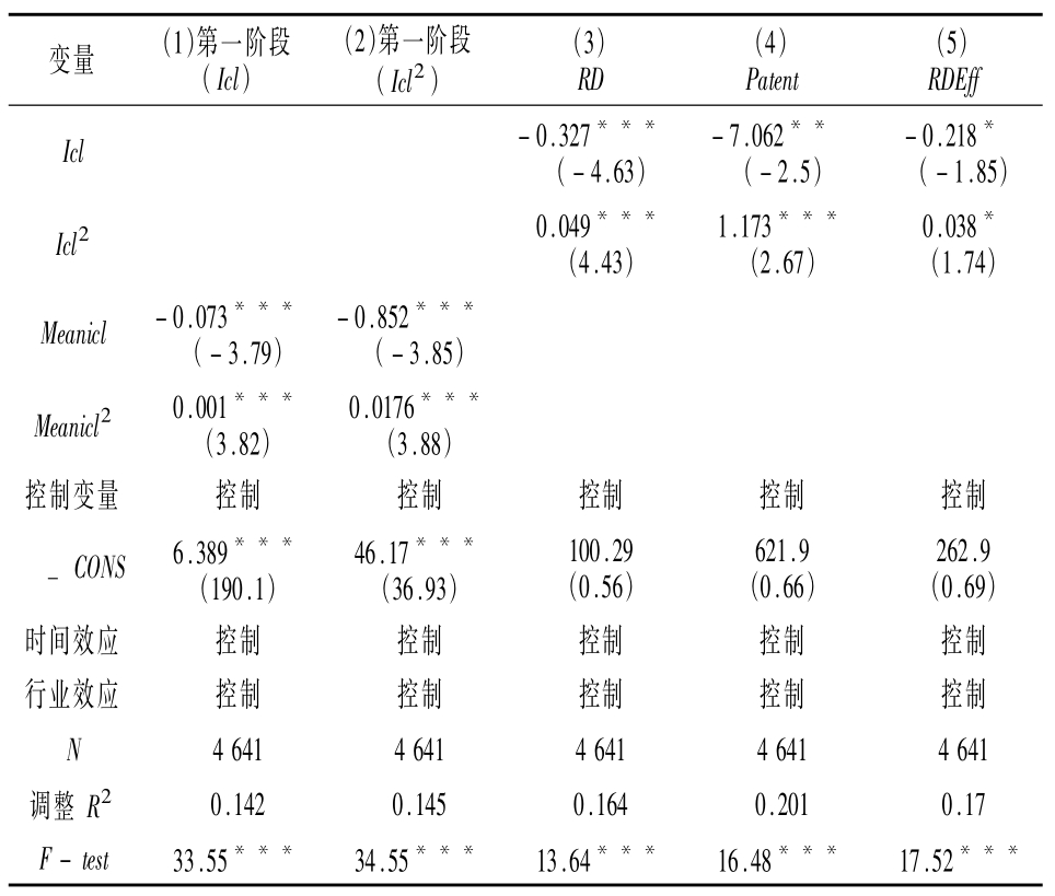 根据工具变量相关性检验,内部控制及其二次项为内生变量,使用行业—年度均值(Meanicl)及其二次项(Meanicl2)作为对应的工具变量,回归结果如表4 所示。第一阶段的系数均显著且F 统计量大于10,说明工具变量与内生变量有较强的相关性,Kleibergen- Paaprk Wald F 和Cragg—Donald Wald F统计量分别为20.785 和14.47 在1%水平显著,通过弱工具变量检验和外生性检验。由表5 可知,减少内生性的干扰后,内部控制对企业创新投入、创新产出和创新效率存在的正U型关系依然成立。