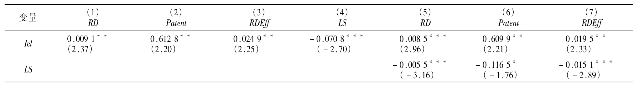 投融资期限错配中介效应的回归结果如表6 所示。由表6 可知,虽然内部控制与企业创新存在正U型关系,但根据其拐点判断,大多数企业内部控制水平已处于拐点右侧,即继续提升内部控制对企业创新仅存在线性促进关系。结合前文发现,投融资期限错配中介效应属于线性中介,无法支撑研究非线性中介效应问题。同时,利用非线性中介效应模型探究投融资期限错配扮演的角色,结果并不显著,理论和实践均表明投融资期限错配不存在非线性中介效应。回归(4)Icl 与LS 在5%水平显著负相关,说明内部控制抑制投融资期限错配,验证假设H2。回归(5)—(7)LS 系数均为负且显著,说明投融资期限错配会抑制企业创新投入、产出和效率,验证假设H3。回归(1)—(7)构成投融资期限错配线性中介效应模型,Icl 和LS 系数均显著,表明投融资期限错配存在部分中介效应,即内部控制通过抑制投融资期限错配行为,促进企业创新,验证假设H4。