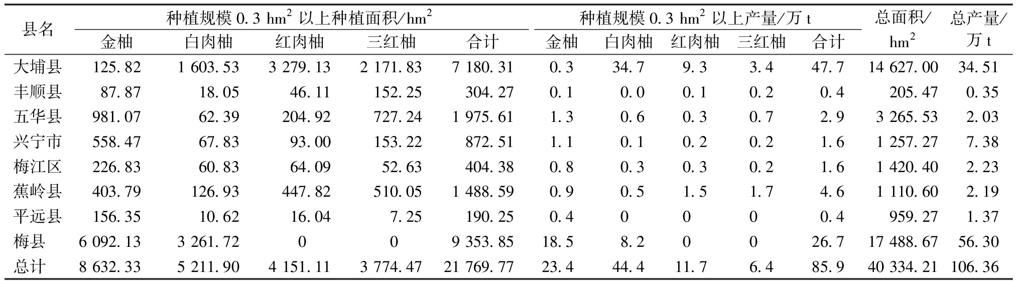 表1 2021年梅州市主要柚品种种植及产量情况