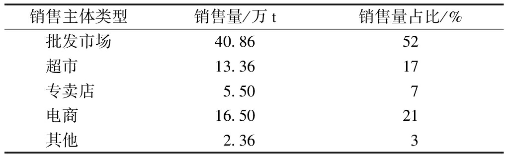 为顺应“互联网+”时代潮流,梅州搭建了集“线下展销+线上远销”于一体的客天下农电商产业园,以此为核心建立了“市域电商+县域电商+企业电商”三级农电商平台。并与广州等珠三角区域探索开展“B2B+O2O”农电商新模式,实现产销两旺。梅州柚基地批发市场销售比例为52%,超市、专卖店、电商以及其他销售主体销售比例分别为17%、7%、21%、3%(表2);由于电商平台蓬勃发展,梅州柚果销售不再以省内为主,省外销售比例为60%,反超省内,省内销售区以珠三角、粤东、粤北、粤西为主,所占比例分别为50%、30%、10%、10%。省外销售市场主要分布在长江以南、北京、上海。