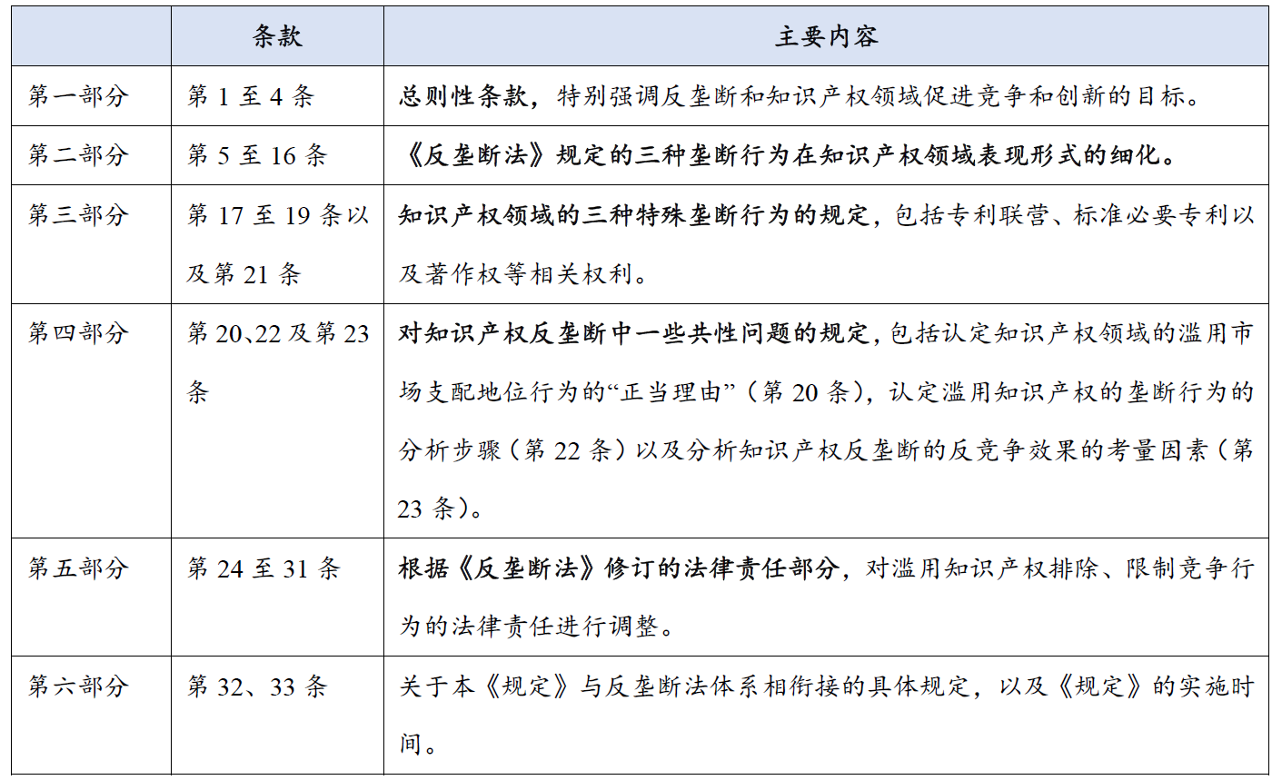 《规定》在篇幅上有较大幅度的增加,由19条增加至33条;内容上,一方面与新《反垄断法》进行了衔接,在体例上更为完善;另一方面针对知识产权领域的典型行为进行了修改,内容上更为详实、具体。