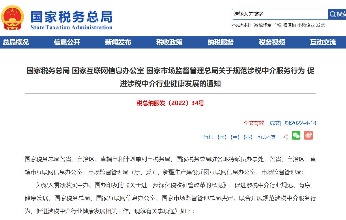为深入贯彻落实中办、国办印发的《关于进一步深化税收征管改革的意见》,促进涉税中介行业规范、有序、健康发展,国家税务总局、国家互联网信息办公室、国家市场监督管理总局决定,联合开展规范涉税中介服务行为,促进涉税中介行业健康发展相关工作。现就有关事项通知如下: