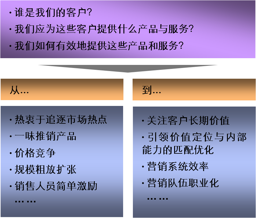 营销大师菲利普·科特勒说,市场中总是那些以明显优越于其竞争对手的方式,解决某种最强烈的未被满足的需要的企业获得成功。所以,仅仅盯住竞争对手谋求以巧妙策划的“商战”取胜是不够的,今天的中国企业需要从“客户需求”出发,更加关注营销的基本问题,实现从凭感觉、拉关系、靠个人经验和闯劲的初级阶段,向借助战略思维、知识和系统的力量的更高阶段转变。