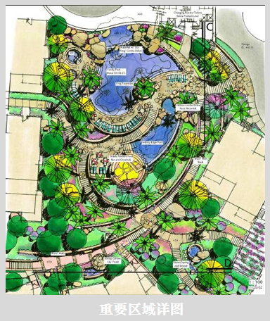3)重要的节点:泳池、水景、老人儿童活动休息空间