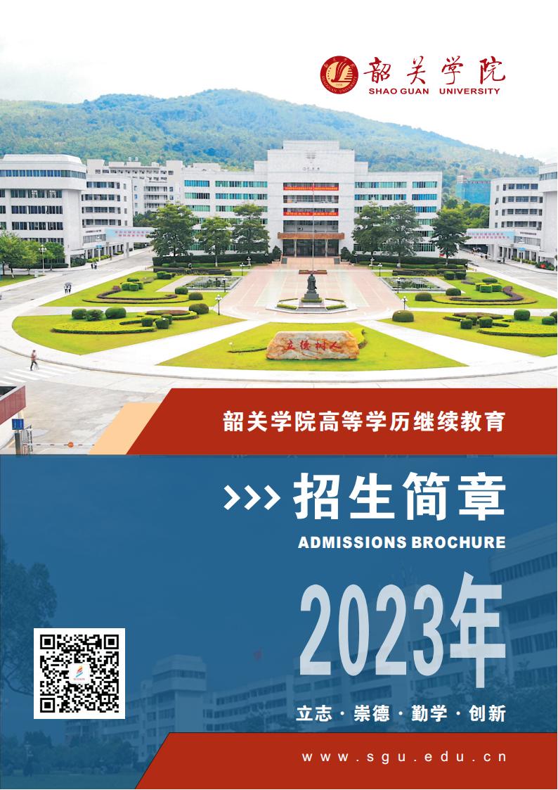 韶关学院是广东省省属公办全日制综合性普通本科大学,是学士学位授予单位、硕士学位授予立项建设单位。目前高等学历继续教育在校生 8858 人。2023年面向全省招收高等学历继续教育学生,其中专升本专业 9个、高中起点专科专业6个。学生学习期满,各科学习成绩合格,颁发韶关学院高等学历继续教育本、专科毕业证书,国家承认学历。在规定学习年限内通过学校规定的外国语考试,成绩合格,符合学士学位授予条件的本科毕业生,可申请高等学历继续教育学士学位。2023年招生简章请点击下方链接 >>>