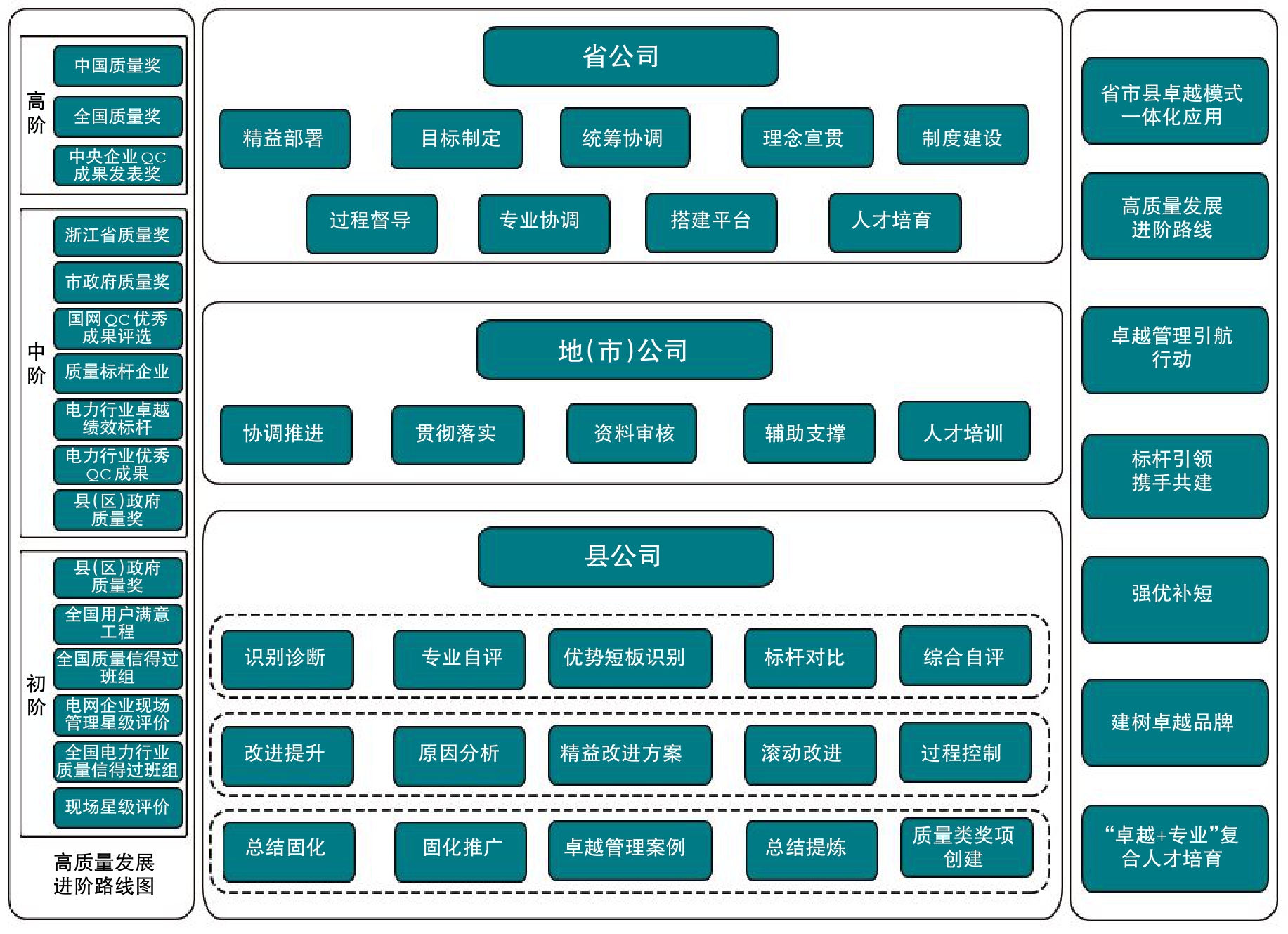 部署整体方案,统筹质量发展目标。国网浙江电力紧扣国网战略落地,结合转型发展新目标,按照“创新驱动、示范引领、共建共享”基本原则,统筹考量基层发展特征,策划“省市县三级”工作规划,运用卓越绩效管理工具,注重专业管理末端融合,发挥卓越绩效模式在夯实企业基础管理上的应用价值。统筹布局“卓越+专业”应用类目,面向客户与市场、资源、过程,关注用户满意度,引导试点县公司参与县(区)级、(地)市级、省级等各级质量类奖项创建。建立短板改进项目池,因地制宜,为不同地域、不同管理水平的基层单位提供科学合理的自我提升途径。