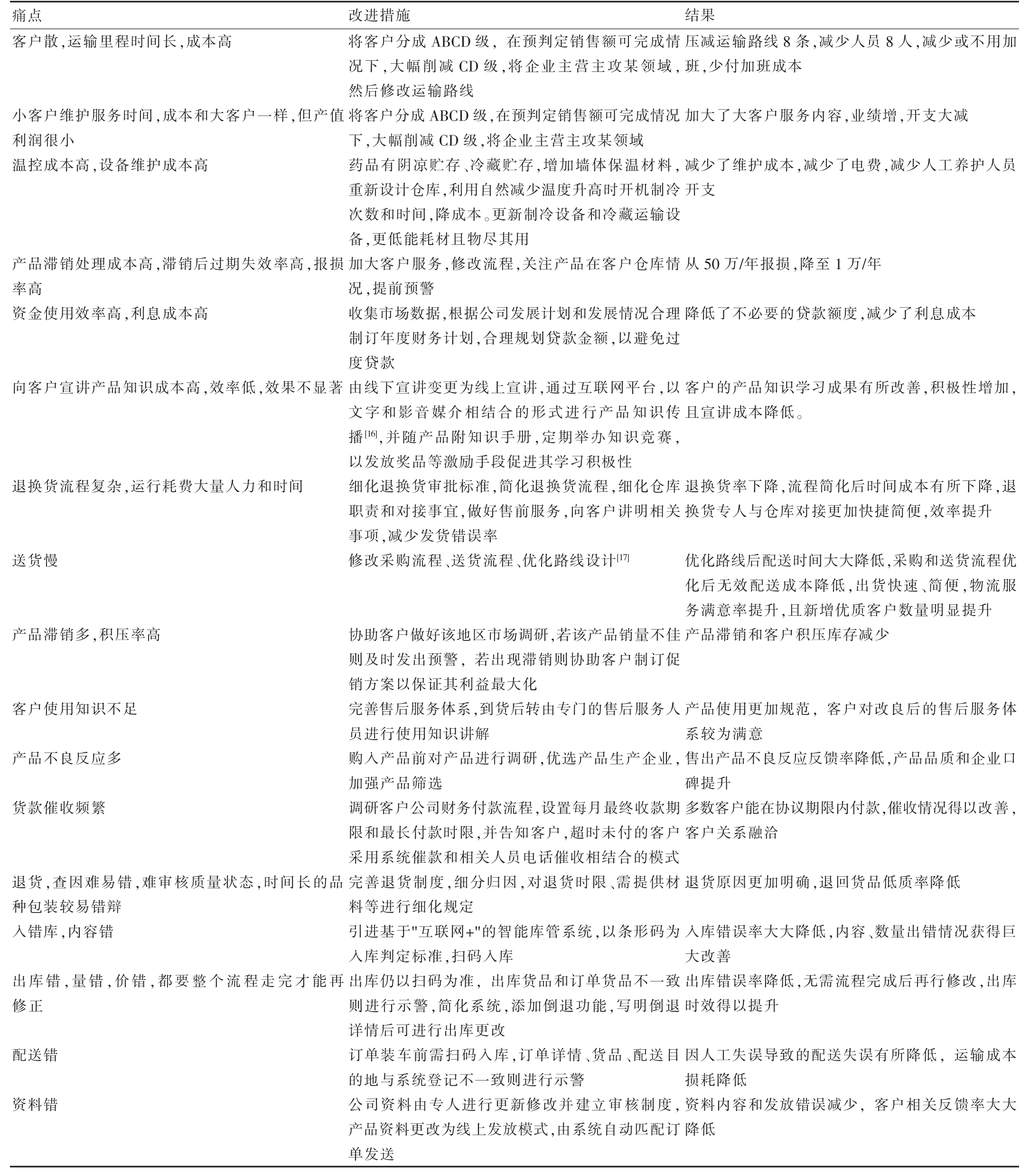 2.2.1 成本痛点 运营成本高是导致利润下降的直接因素[13]。由于当前“互联网+模式”和物流行业的快速发展,客户所在地不仅仅局限于当地及其周边辐射地区,客户所在地分散,且部分客户所在地区偏远,造成运输里程时间长,提高了运输成本。随着市场经济结构的改革,我国医药流通企业的主要销售渠道不仅局限于以往的批发企业和医疗机构,零售终端也加入了客户目标群体之中,但小体量客户维护服务时间成本并未因其购买量低而降低,其所需成本与大体量客户相同,但同样的成本付出带来的产值利润差距较大。向客户宣讲产品知识是药品流通的必要流程,但分析发现,当前宣讲模式成本高,其知识普及效率却很低,宣讲效果不显著。当前国家政策鼓励新药研发,新药面世或对已有同类药的销售造成冲击,或由于其本身不具竞争力导致自身滞销,滞销后失效率和报损率高,其处理成本相应提高。产品库存量大,温控成本高,设备维护成本也相应提高。当前退换货流程设计较为复杂,整个过程运行耗费大量人力和时间成本,增加相关岗位员工无效工作量[14]。由于企业扩张、发展需求,资金使用率高,其产生的利息进而增加,从而增加成本。
