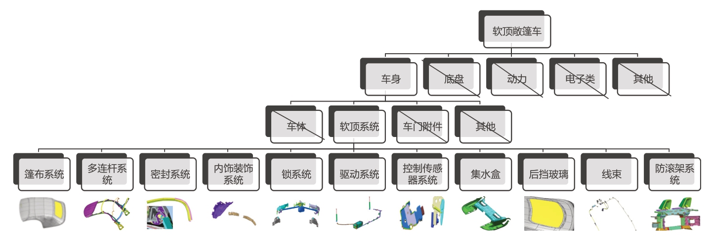 采用树图工具,确定研究对象(如图1)。从整车开始往下分解。由于该车型的软顶系统为该市场的赢点和消费者的兴奋型需求,且为四新零件(新零件、新材料、新工艺、新供应商),故将该项目的项目范围确定在软顶系统,包含篷布系统、多连杆系统、密封系统、内饰装饰系统、锁系统、驱动系统以及控制传感器系统等零件。