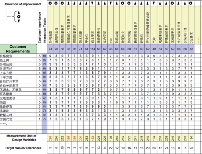 通过质量屋工具,将用户需求转化为软顶系统的功能。先在质量屋的左墙写用户需求并给重要度打分(按1、2、3、4、5分打分,分值越高重要度越高),再在天花板上对产品的功能进行展开,接着在房间按关联度打分(1、3、5、7、9,分值越高关联性越强),然后计算各功能特性的总得分并排序(功能得分计算方法,每项用户需求重要度乘以关联度,再将各项乘积相加求和),最后将在屋顶填写各功能的相关性。通过质量屋可以得到,各功能的重要性排序(如图4),并可得出,用户关注的前五位功能为成本要求、耐久可靠性、感知质量要求、防水性能和外观造型,这五大功能为重点关注项。