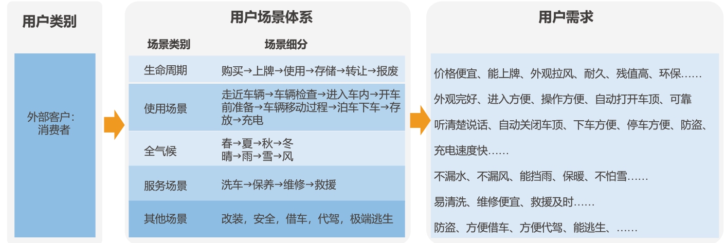 接着收集不同类型客户的声音。这三类客户中内部客户和政府制度类最容易收集,内部客户采用技术接口单(ICD)和制造要求单(MR)等内部流程方式收集;政府法规类主要是满足汽车行业相关法规即可;而消费者的客户声音最难系统收集。为此,建立用户场景体系,从购车到车辆报废全生命周期,从走近车辆、用车、停车、停放充电等全场景,从晴天到雨天、下雪天等全气候,从洗车、改装到维修等全服务场景等,进行系统分析调研和收集用户的声音(如图3)。