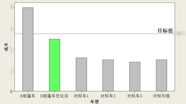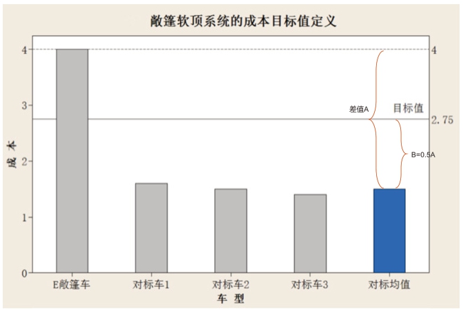 采用DCD(设计概念描述)和标杆分析,确认目标值。按目前的概念方案,对零部件成本进行工程分析,并对行业标杆车进行工程成本分析。将目前方案成本与行业对标车成本进行对比,发现成本有很大的优化空间。 将E敞篷车与标杆成本均值差值A的50%再加上对标车的均值,定义为降本目标值(如图2,目标值=对标均值+0.5A)。从图2可以看出,降本目标值为成本降低31%以上。