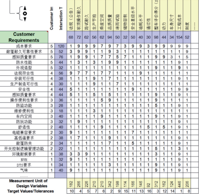 通过质量屋工具,将用户需求的系统功能转化为软顶系统的关键技术参数。先在质量屋的左墙写系统并给重要度打分(按1、2、3、4、5分打分,功能排序按五档进行划分,排在前20%档位的功能重要度定义为5分,后序档位依次定义为4、3、2、1分)。再在天花板上对系统的参数进行展开,接着在房间按关联度打分(1、3、5、7、9,分值越高关联性越强),然后计算各参数的总得分并排序(功能得分计算方法,每项用户需求重要度乘以关联度,再将各项乘积相加求和),最后将在屋顶填写各功能的相关性。通过参数排序可以发现,用户关注的前五位功能为工程成本、品质质量、整车评审得分(SUSA)、软顶操作耐久和路试耐久,这五大功能为重点关注项(如图5)。针对这5项重点关注项,制定不低于竞品车的技术指标值。