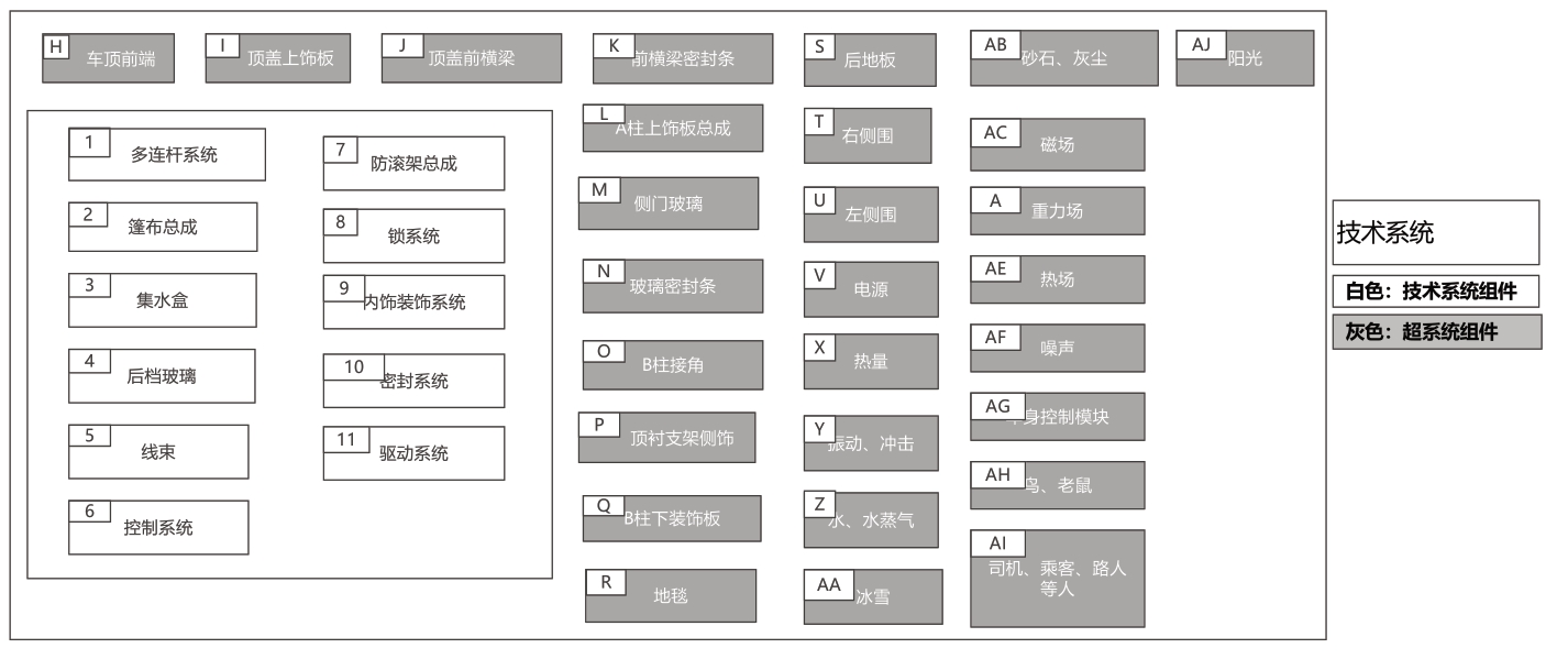 通过系统框图分析,确定软顶系统的具体研究对象和整个系统边界[3]。先将多连杆系统、篷布系统、集水盒、后挡玻璃、线束、控制模块、防滚架总成等定义为技术系统,为研究对象。然后将与软顶系统有关联的定义为超系统组件,如:车顶前端、顶盖上饰板、顶盖前横梁、前横梁密封条、A柱上饰板、侧门玻璃、玻璃密封条、B柱接角、顶衬支架侧饰板、B柱下饰板、地毯、后地板、左侧围、右侧围、阳光、水、风、冰雹、砂石、灰尘等(如图6)。