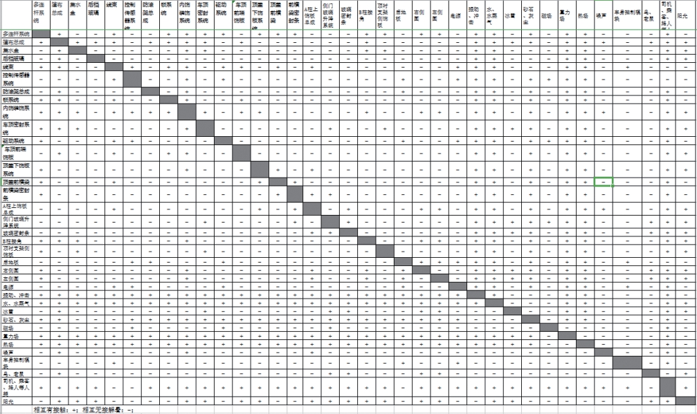 将找到的所有组件进行相互作用分析,找到组件之间的相互关系。先所有组件按行和列分别列成表格,在行和列交叉的格子里面填写二者的关系,“+”代表二者之间有接触、有相互作用,“-”代表二者之间无相互接触、无相互作用(如图7)。