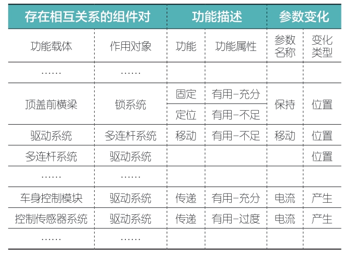 按照相互作用分析得出来的结果,针对标”+”号的组件进行功能分析。并将功能按有用-充分、有用-不足、有用-过度和有害功能进行分类,后三种功能为重点关注对象。从功能分析可以发现,顶盖前横梁对锁系统的定位功能为有用-不足功能,驱动系统与多连杆系统的移动功能有用-不足功能,控制传感器系统与驱动系统传递电流(信号)功能与车身控制模块与驱动系统传递电流(信号)重复,为有用-过度功能(如图8)。与这些不足和过度功能相关的零部件,即为重点研究对象:顶盖前横梁、锁系统、驱动系统、多连杆系统、车身控制模块和控制传感器系统。