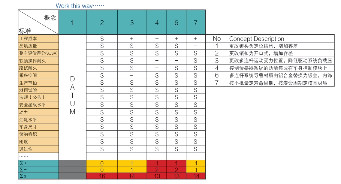 对生成的概念方案进行整理,可发现方案5和方案8为策略方案,其余为技术方案。由于方案5在成本类别中为对成本的影响排在第一位,方案8在成本按零件排序中占比在80%以内,故首先选定。其余技术方案通过普氏分析工具进行评价(如图12)。将方案1作为基础方案,其余方案作为被评价方案。将2.2.3识别出来的关键技术参数指标作为评价指标,对各方案进行比较评价。与基础方案相同的标示“S”,比基础方案差的评价项标示“-”,比基础方案好的项目标示“+”。从结果可以发现,各方案工程成本都有优势,但均有不同的缺点。这些标“-”的缺点需要重点关注,详细设计和DFMEA分析时要有对应的对策。
