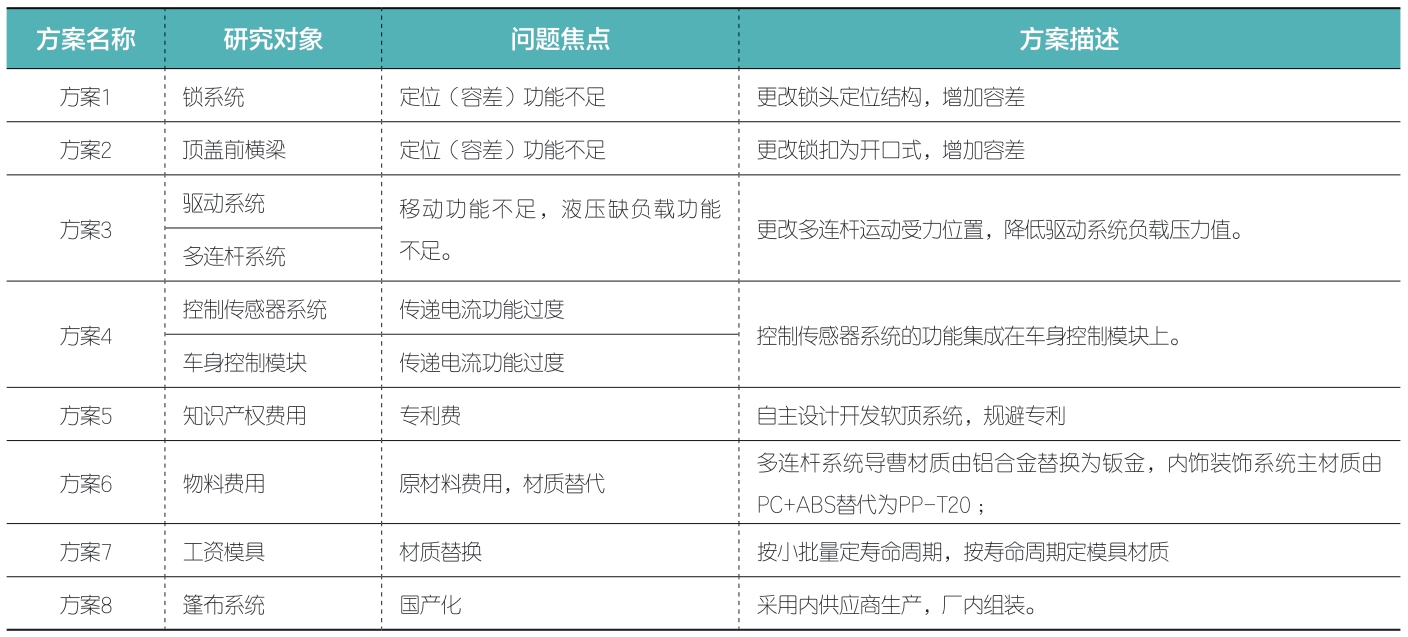 从功能分析和成本分析中确定研究对象,生成以降本为目标的技术概念方案。根据2.3.3中的前顶前横梁对锁系统的定位功能不足问题生成了方案1和方案2:分别通过更改锁头定位结构和锁扣形式,还增加容差能力,降低对制造和多连杆系统刚度的要求;通过驱动系统对多连杆系统移动功能不足问题,生成了方案3:更改多连杆运动受力位置,降低对驱动系统负载压力值,从而降低对驱动系统的要求;针对2.3.3中分析出来的控制传感器系统和车身控制模块对传递电流的功能过度问题,生成了方案4:将控制系统的功能集成在车身控制模块上,减少零部件从而降低成本;根据2.3.4成本分析确定的知识产权费用占比大问题,生成了方案5:自主设计开发软顶系统,分析研究专利并规避专利的开发策略;针对物料成本问题,生成了方案6:采用原材料替你策略,寻找各零部件材质替换方案;针对工装成本问题,生产了方案7:工装夹具按小批量寿命要求,寻找材质替换文案 ;针对篷布系统成本问题,采用国产化策略方案。各方案汇总如图11所示。