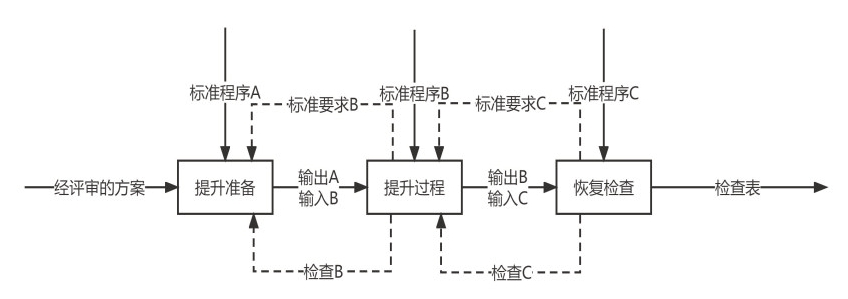 在空中造楼机施工过程中就是要做到标准化,包含标准化的计划,标准化的准备,标准化的流程,标准化的实施,标准化的检验。在施工过程当中只要做到了每个环节的标准化,就必然会大大提高空中造楼机的施工质量,提升顾客满意度。图1为空中造楼机分为提升准备、提升过程以及恢复检查等三个环节标准流程的动线图。