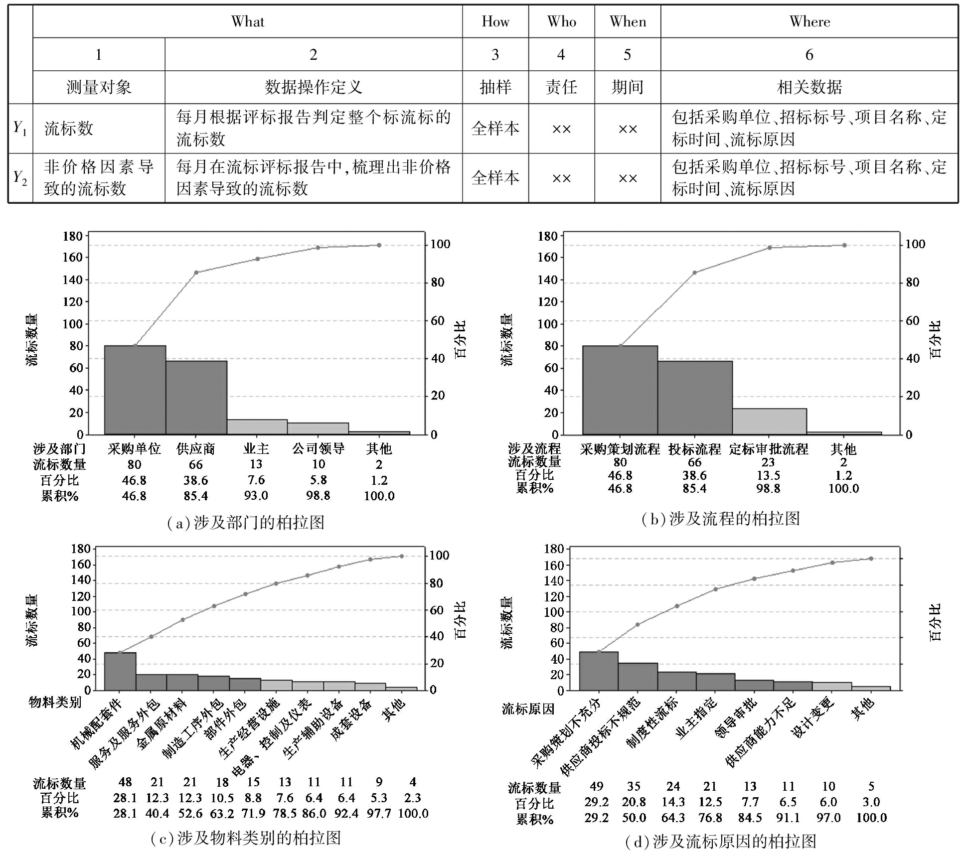 采用柏拉图通过流标涉及的部门、流程、物料类别、流标原因等多维度多层次进行Y的现状分析,如图1。