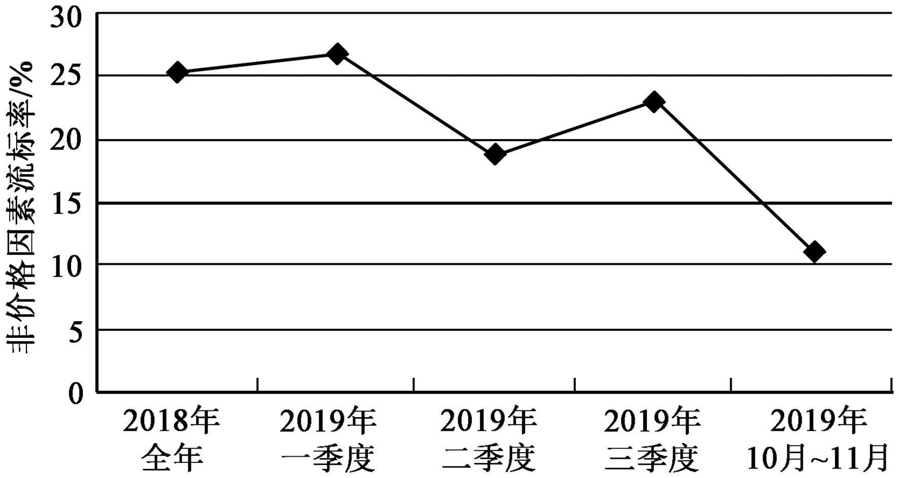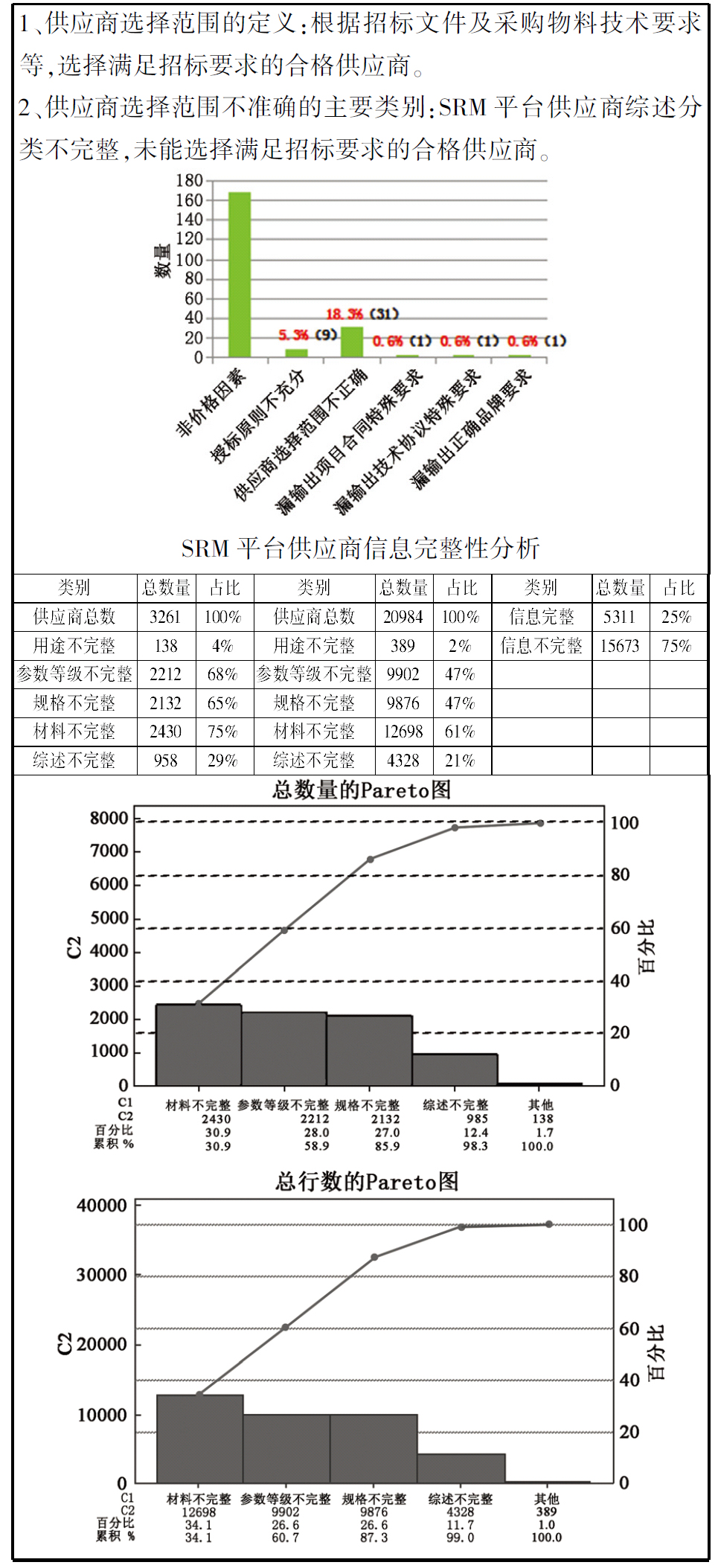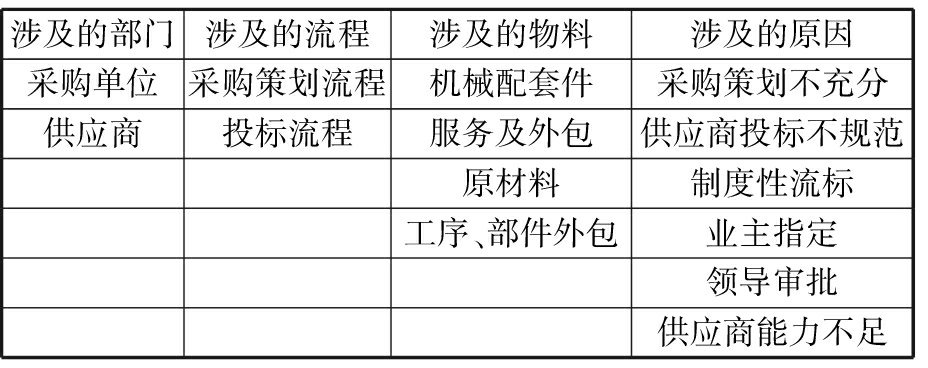 通过梳理分析:2017年非价格因素流标率25.4%,2018年非价格因素流标率25.5%,2019年一季度非价格因素流标率26.9%,导致公司重复招标,采购周期延长,采购成本增加,影响产品配套产出。